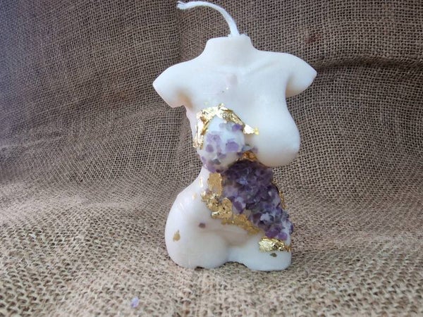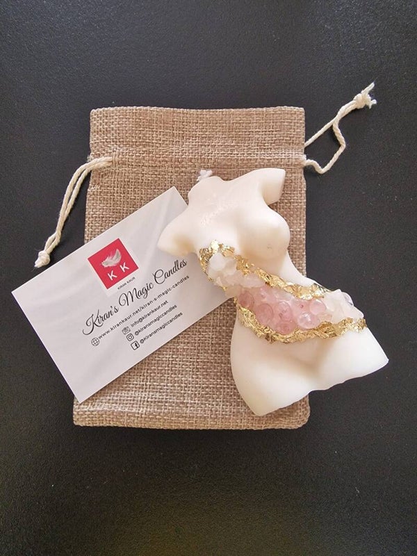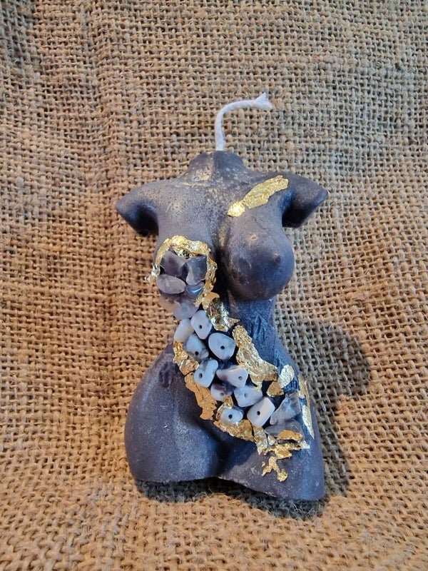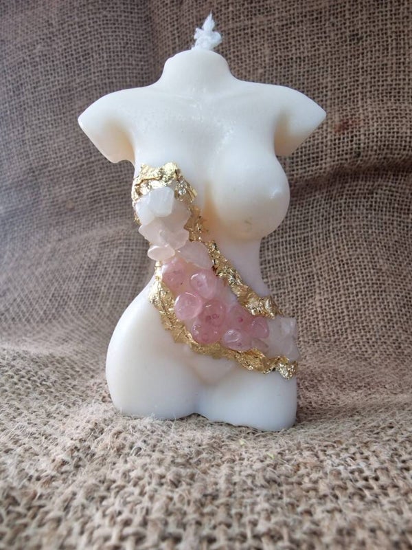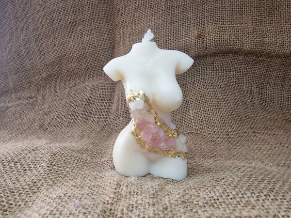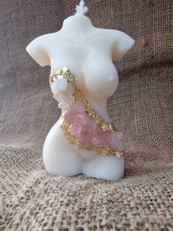 This stunning hand poured soy wax female torso candle with crystal chips that helps to bring a balance to mind, body and emotional state and enhances the intention of healing, ideal for all ocassions. Personalise yours by choosing your crystal chips and scent and have it delivered to you.