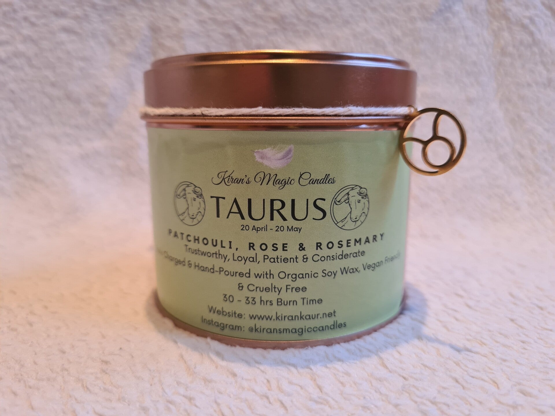 This stunning hand poured soy wax candle is part of the Zodiac Collection an awesome Birthday gift. Taurus, Patchouli scented with Rose and Rosemary and reiki charged charm to enhance the qualities of the zodiac sign.