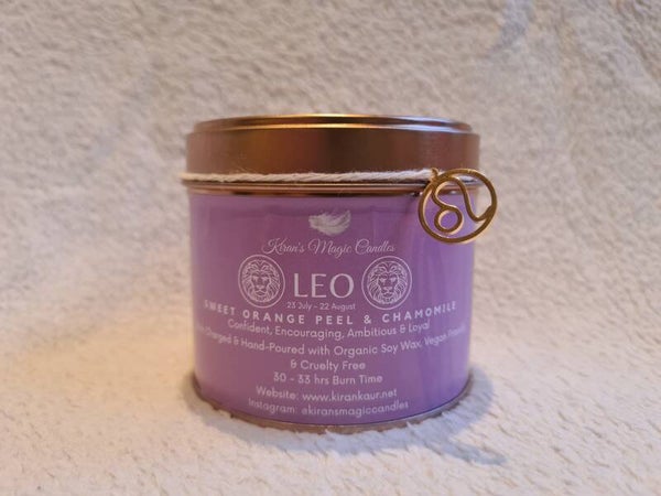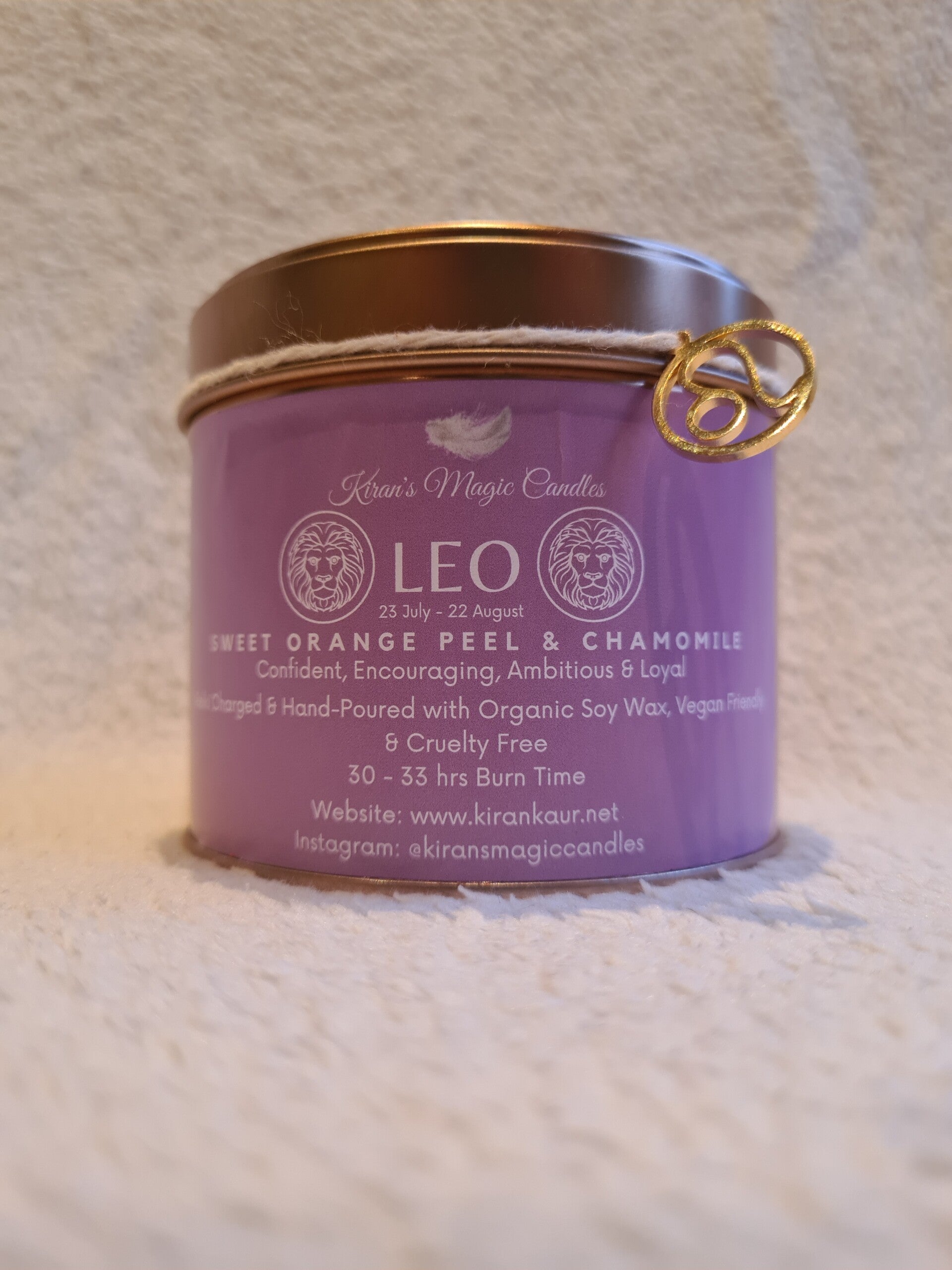 This stunning hand poured soy wax candle is part of the Zodiac Collection an awesome Birthday gift. Leo, Sweet Orange scented with Orange Peel and Chamomile and reiki charged charm to enhance the qualities of the zodiac sign.
