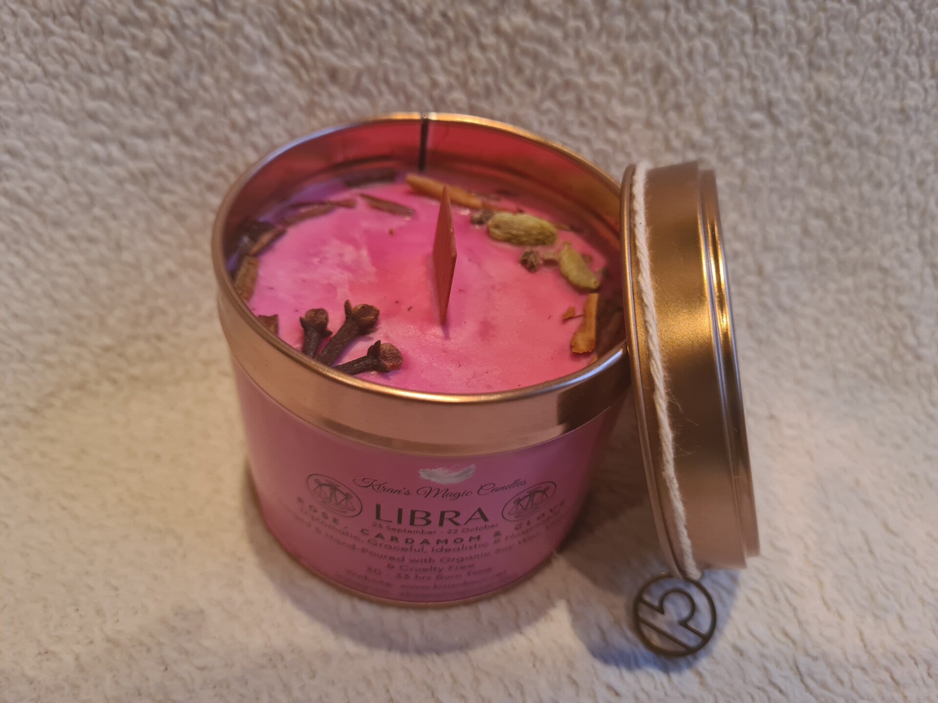 This stunning hand poured soy wax candle is part of the Zodiac Collection an awesome Birthday gift. Libra, Rose scented with Cardamom and Clove and reiki charged charm to enhance the qualities of the zodiac sign.