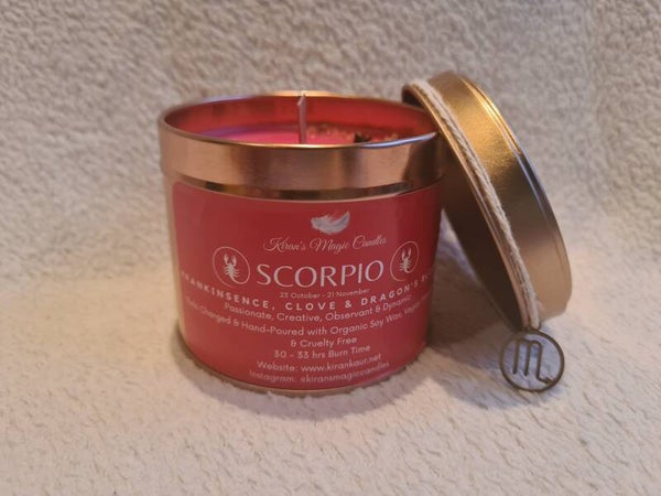 This stunning hand poured soy wax candle is part of the Zodiac Collection an awesome Birthday gift. Scorpio, Frankincense scented with Clove and Dragon’s Blood and reiki charged charm to enhance the qualities of the zodiac sign.