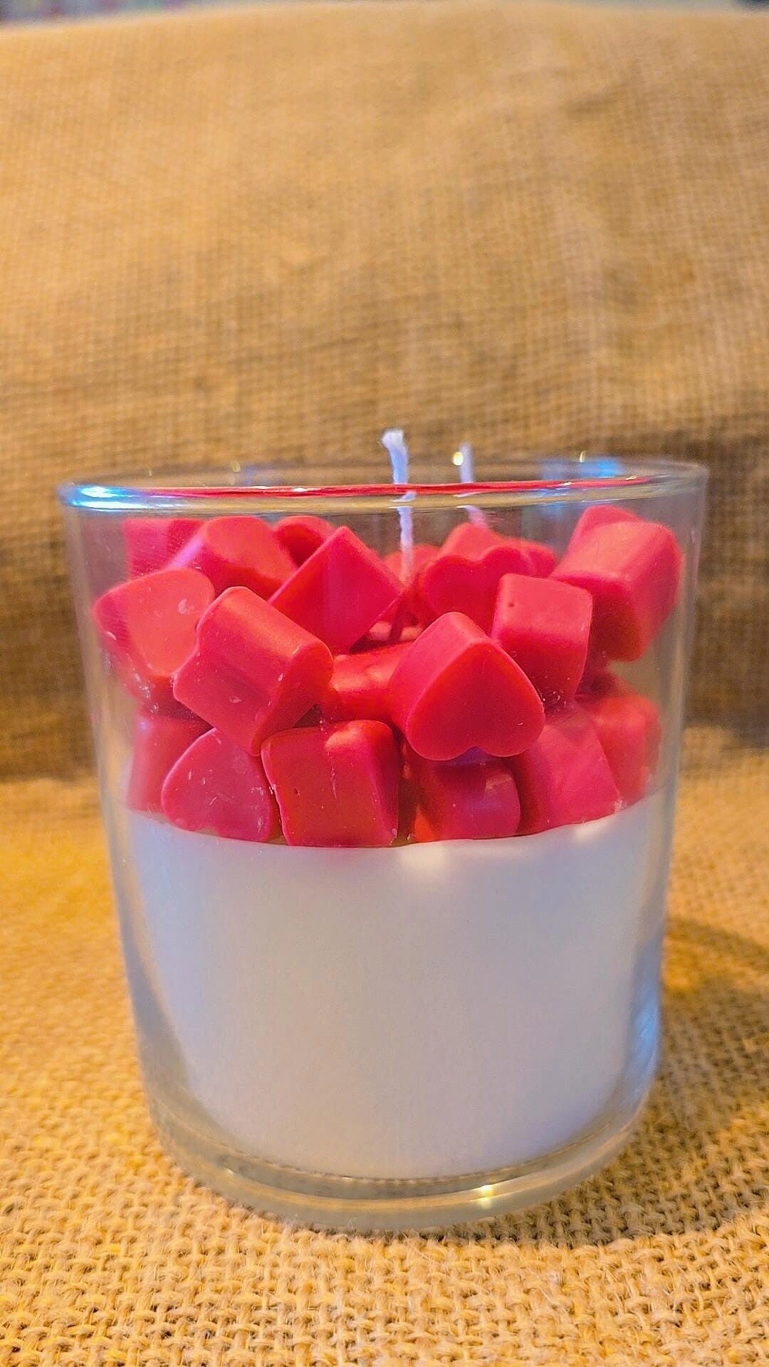 Gift this stunning hand poured soy wax Love Candle with a "I Love You". Scented with Garden Rose white base with tiny pink hearts.
